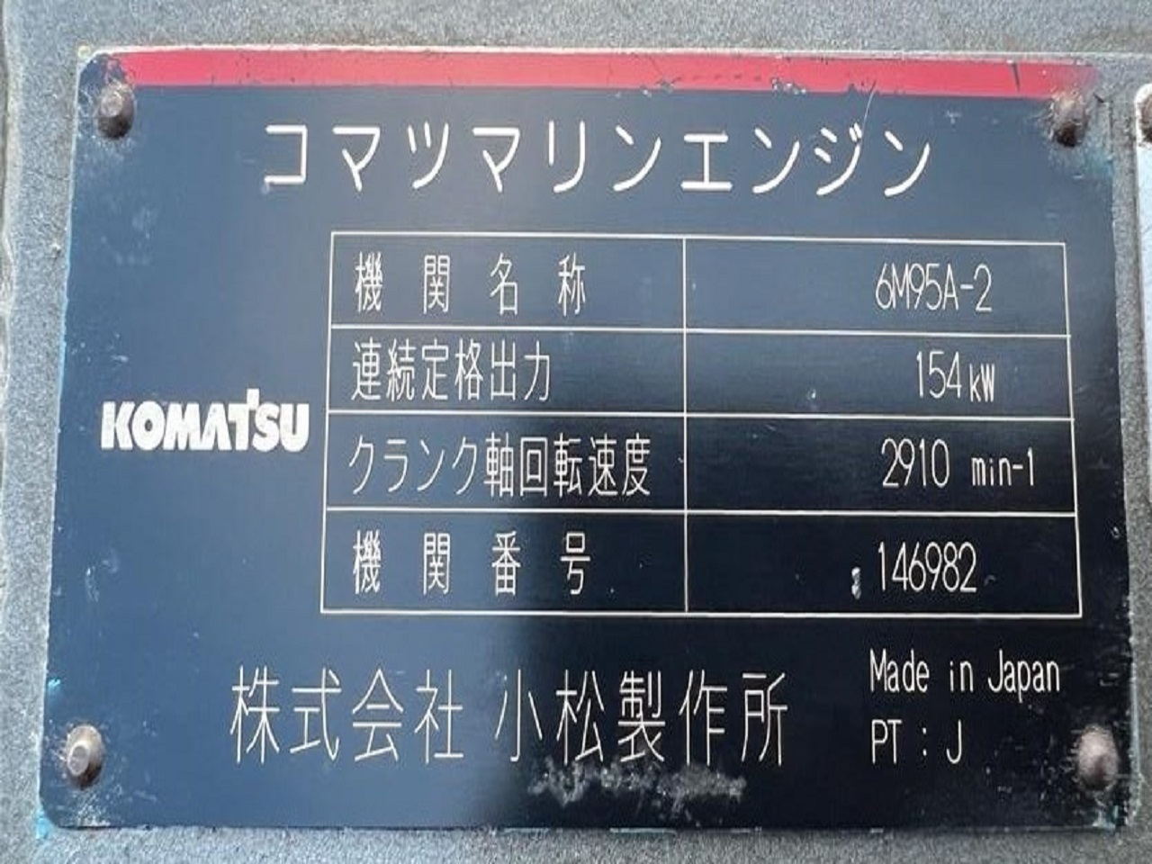The KOMATSU 6M95A-2 146982 is a 6-cylinder marine diesel engine from the GH series, often configured with a 430HP to 440PS output, designed for commercial marine applications.