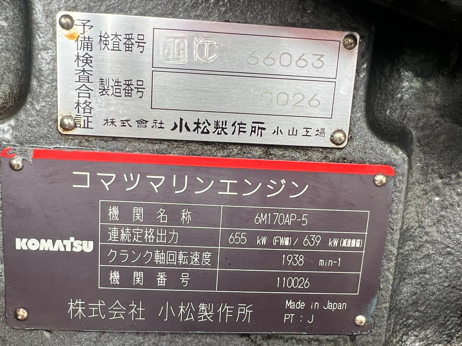 The KOMATSU 6M170AP-5 110026 is a 6-cylinder marine diesel engine from the GH series, often configured with a 430HP to 440PS output, designed for commercial marine applications.