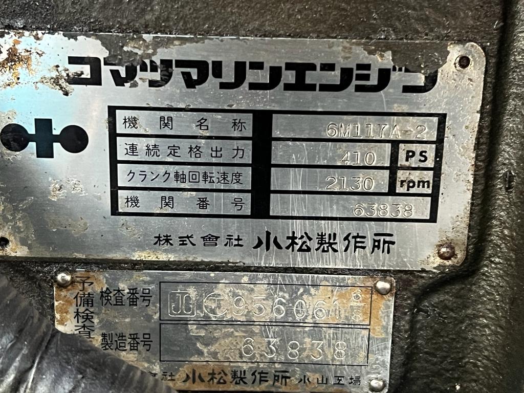 The KOMATSU 6M117A-2 63838 is a 6-cylinder marine diesel engine from the GH series, often configured with a 430HP to 440PS output, designed for commercial marine applications.